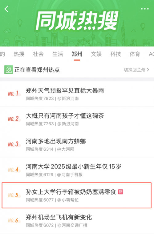 近日,一则关于亲情的温暖故事悄然登上微博郑州同城榜热搜,话题#孙女上大学行李箱被奶奶塞满零食#引发广泛关注与热…