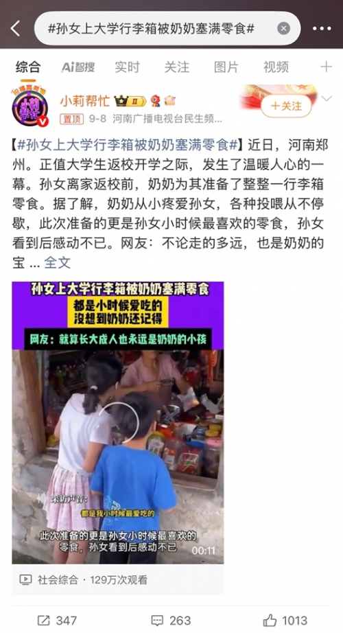 近日,一则关于亲情的温暖故事悄然登上微博郑州同城榜热搜,话题#孙女上大学行李箱被奶奶塞满零食#引发广泛关注与热议,成为大学生返校季中最打动人心的一幕。