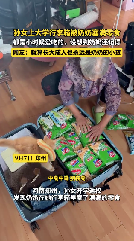 随着暑期假期结束,各大高校陆续开学,一位河南郑州的女大学生在互联网上分享了自己即将前往外地上大学前,奶奶为其准备了整整一行李箱她小时候最爱的亲亲零食。据了解,奶奶自幼就对孙女疼爱有加,各种“投喂”从不停歇。而这一次,奶奶特意挑选了孙女童年时期最喜爱的零食,从酥脆的虾条到甜蜜的果冻,每一样都承载着深深的牵挂与回忆。